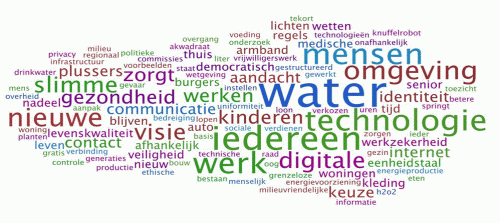 Onderstaande woordenwolk geeft weer welke woorden het meest voorkwamen in de visies van het Vlaamse burgerpanel. Hoe grote het woord, hoe frequenter het gebruikt werd om de visies te beschrijven.